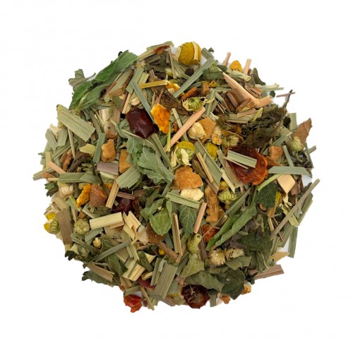 Трав’яний чай на основі ромашки, цедри апельсина ,меліси, шкірки шипшини, листа малини, м’яти перцевої, яблука, лимонної трави та ароматизатору «Альпійські трави».