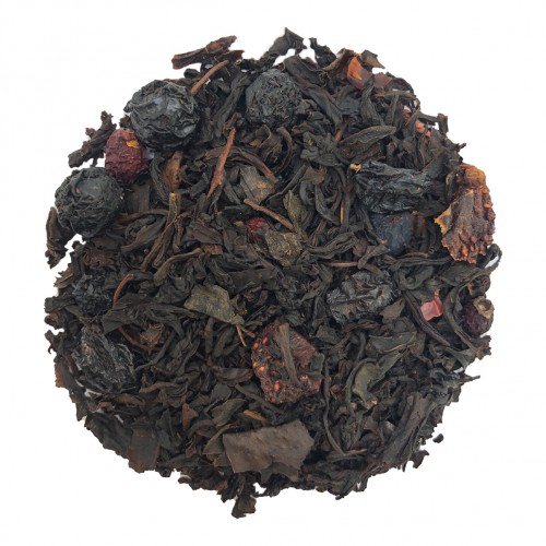 Чорний чай крупнолистовий, малина, полуниця суха, смородина , глід, шкірка шипшини, журавлина, сухий виноград, аронія, вишня з кісточкою , ароматизатор « Лісова ягода».