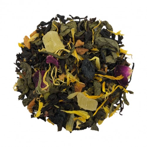 Купаж крупнолистового чорного та зеленого чаю з додаванням ананасу, яблука, сухого винограду, календули, цедри апельсина, бутонів і пелюстки троянди та ароматизатора натурального "Виноград".